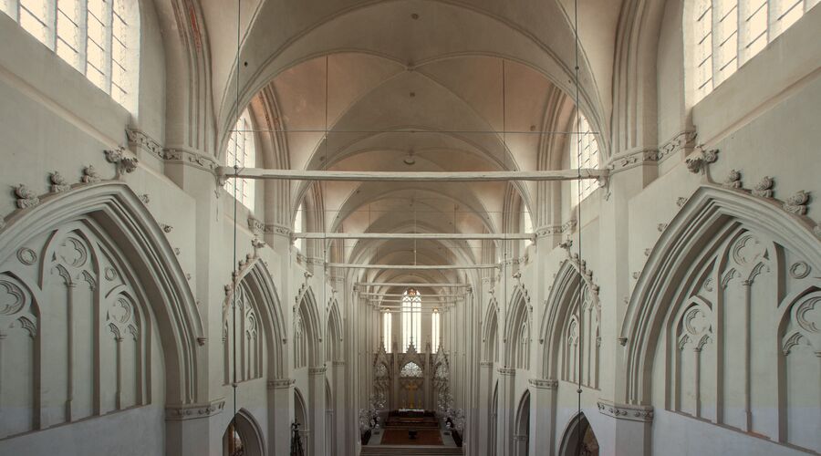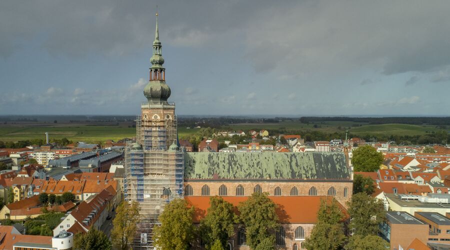 Der zwischen 1250 und 1410 erbaute Dom St. Nikolai steht darüber hinaus in vielerlei Hinsicht mit dem Maler Friedrich und seiner Familie in Verbindung: Bereits die Eltern Friedrichs, Gottlieb Adolf Friedrich und Sophie Dorothe Bechly aus Neubrandenburg, schlossen hier im Januar 1765 den Bund der Ehe, nachdem sie nach Greifswald umzogen. Mit seinem fast 100 Meter hohen Turm ist der Dom St. Nikolai das Wahrzeichen Greifswalds. Er bildet gemeinsam mit den anderen beiden Kirchen der Stadt, mit St. Marien und St. Jacobi, die eindrucksvolle Silhouette der alten Hansestadt Greifswald. Diese setzte Friedrich im Übrigen in den Gemälden „Wiesen bei Greifswald“ (1820/22, Hamburger Kunsthalle) und „Greifswald im Mondschein“ (1816, Oslo, Nationalgalerie) in Szene. In dem Ölgemälde „Gartenlaube in Greifswald“ (1818, Neue Pinakothek in München) steht St. Nikolai im Mittelpunkt des Bildes und ist gotisch überarbeitet und überhöht dargestellt.